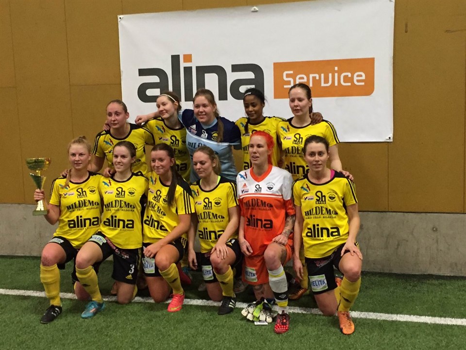 Med 2 lätta träningar inne i Diös i veckan efter att varit lediga i 3 veckor med god julmat och massor av klappar under granen var vi igång igen, cup inne med 10 lag i två grupper medan snön yrde utanför knutarna. Vi har gått bra i turneringarna före jul och sättet vi vill spela på och lyckats i dom flesta matcherna har gett oss skön och go känsla i ryggen. Många spelare som fortfarande är på ledighet samtidigt som några känner av ömma muskler och febriga pannor, vi hade skrapat ihop 2 målvakter och 10 utespelare till söndagens spel. Vi började mot Knivsta i första gruppspelsmatchen och det blev spel mot ett mål i 20 min, våra motståndare fick inte iväg något avslut mot vårat mål samtidigt som vi gjorde som vi ville på deras planhalva. Slutresultatet blev "bara" 5-0 som kanske borde varit det dubbla. Målen: Sofia F 2, Elin L, Annika. Lång väntan till nästa motståndare som var Vaksala 2, spelet var förlagt återigen på offensiv planhalva och dom fick kämpa med alla medel för att hålla siffrorna nere. Det blir ingen match med någon spänning alls i utan vi vinner enkelt med 7-0, Sofia fick känning i baksida lår och fick kliva av efter 6 min, så vi fick rotera på 3 backar resten av turneringen. Målen: Tyra 3, Elin L 2, Sara, Elva. 1 h 45 min till nästa match så vi tog bilarna och åkte iväg med hela gruppen och åt en gemensam lunch som var mycket uppskattat av spelarna. I tredje matchen möter vi seriekollegan Rimbo som vi vet har ett par spelare som vi måste kväva med smarta motdrag, vi har taktpinnen under hela matchen och skapar några hyfsade lägen men det är Rimbo som har den bästa chansen men vi får undan den på mållinjen. Matchen slutar 0-0 och båda lagen är fortfarande obesegrade, dom slutar på 10 poäng och massor av plusmål. Vi måste vinna med 4 mål i sista matchen för att vinna gruppen. Danmark försökte ligga lågt i defensiven och försöka stänga ytor men alla i laget klarade inte av det utan några pressa halvhögt och några låg väldigt långt ner i plan, ytorna centralt blev stora när vi med enkla lösningar var förbi deras utspridda lag. Vi hinner göra 8 mål och vinner gruppen på 10 p och 20 gjorda mål. Målen: Annika 3, Elin L 3, Tyra, Sara. Semifinal mot Östervåla som blir tvåa efter Vaksala 1 i den andra gruppen, deras lag är ungt men dom har en tydlig plan och genomför den på ett imponerande sätt. Lagets nr 10 är riktigt rolig att se på, hennes snabba fötter och orädda inställning var en fröjd att följa. Vi vinner men det börjar synas att vi har en liten trupp, energin och orken finns inte hela tiden på några positioner. Målen: Tyra 2, Agnes. Final mot Rimbo som vinner enkelt mot Vaksala 1 i sin semifinal, turneringens två bästa lag möts igen och så ska det ju vara eftersom vi båda spelar i ettan. Samma matchplan som förra matchen och det var viktigt att fortsätta med tålamodet i vårat anfallsspel samtidigt som vi måste skapa fler vassa lägen att göra mål på. Inledningen av matchen visade Rimbo stor respekt och backade ner med alla spelare på sin planhalva och satsade enbart på våra misstag och snabba omställningar, dom lyckades rätt bra men några egna chanser hade dom inte. Vi gör 1-0 och då börjar dom ligga högre upp i plan och störde oss tidigare i våra uppspel, vi blir lite stressade och vi är inte speciellt organiserade i våran defensiv men några stora chanser får dom inte till. Vi gör 2-0 i slutet av matchen och cupen var vår igen. Målen: Tyra 2. Kaisa som stod finalen blev vald till bästa målvakt, hade Tilda stått sista matchen hade nog priset gått till henne. Hela turneringens bästa spelare herr, junior och dam gick till Tyra. Laget: Tilda (mv) Kaisa (mv) Viktoria Agnes Frida Sofia Elin M (k) Elva Sara Tyra Elin L Annika Max Andersson