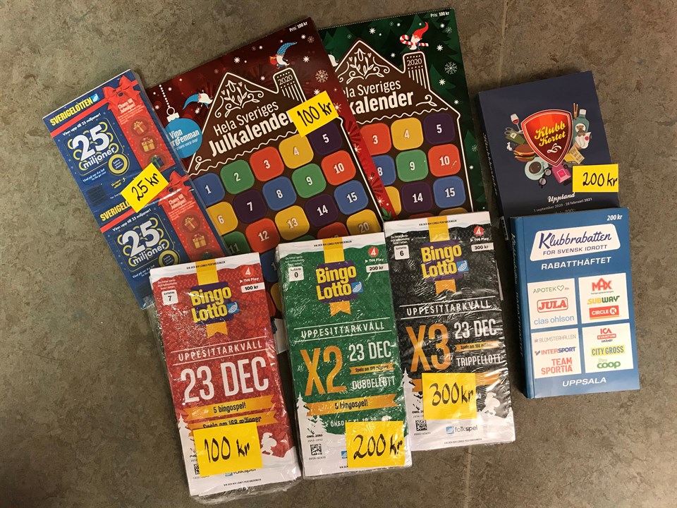 Nu är julen snart här och Gusk har många olika lotter att sälja inför advent och jul Istället för att köpa era lotter i en butik så passa på att stötta GUSK genom att köpa era lotter av oss:-) Ni kan välja att stötta vilket lag/sektion ni vill genom att uppge det när ni köper era lotter här på kansliet Vi har följande till försäljning: Sverigelotter (25:-) Julkalender (100:-) "Uppesittarlotter" till den 23 december. Finns vanliga enkla för 100:- dubbellott för 200:- och x3 lott för 300:- Vi har också klubbrabatter och Klubbkort (200:-) Vi har bingolottoförsäljning på Willys Gränby och Coop Forum Boländerna under julveckan. Ni är också välkomna till kansliet och köpa lotter. Man kan betala kontant eller med swish. Vi kan också leverera lotterna hem till dig som bor i Uppsala. Maila eller ring till kansliet och beställ lotter. 018-323800, kansli@gusk.nu Swisha betalning för lotterna till 1236144406 Vi leverar lotterna hem till dig.