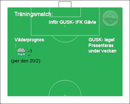 För imorgon och på torsdag genomförs träningen som vanligt inne på Anders Diöshallen. Samling klockan 2015. Under veckan som kommer då fokuserar vi på att skapa egna ytor, allt enligt vår spelidé och utveckling av individerna i gruppen. Tisdagens och torsdagens träningen kommer också innehålla träningsmoment inför säsongens förfest då vi reser till Gävle för match mot stadens kamrater. Matchtruppen till Gävle blir troligtvis 14+2 spelare. Mer om matchtruppen senare under veckan. Matchen mot IFK Gävle är på herrallsvenska arenan Strömvallen och domaren blåser ingång klockan 10. Det skall bli spännande att starta upp säsongen och mäta oss mot ett bra motstånd. Enligt en norsk källa av väderprognosen per den 20/2 säger att det skall bli någon minusgrad och eventuellt snö. Vi kommer hålla lagsidan uppdaterad när det gäller väderprognosen på lördag. Uppdatering truppen, lagets forward #60 Alexandra Annerklev kommer troligtvis ner under veckan och fortsätter med sin rehab träning. Vi hoppas att Alexandras knä håller och att hon kan öka sin träningsdos med tiden. Trots helgens resultat i ÖSK- damcup visar GUSK att det finns duktiga spelare i de yngre leden. Framtiden ser god ut för framtida framgångar för Gamla Upsala SK. Snart startar säsongen på riktigt, fotboll är gött! Välkomna!
