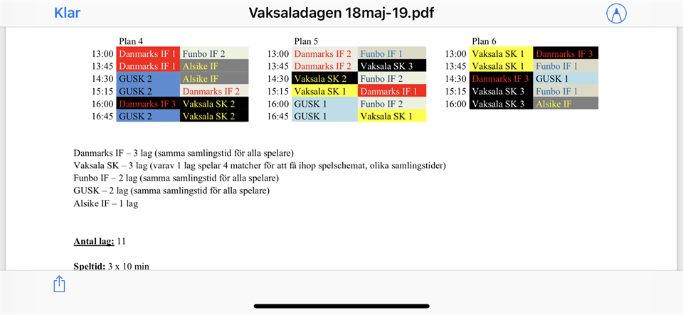Hej, Här är spelschemat till poolspelet i Vaksala. Bägge lagen börjar kl 14.30 och spelar sista matchen 16.45. Spelarna åker direkt dit från lägret. Ni föräldrar tar med dem hem från Årsta IP. Laguppställningen meddelas sannolikt först på lägret. Det är Vaksaladagen så mycket folk där. Tips är att parkera vid Kristallen då vi spelar på de planerna som är på andra sidan järnvägen MIT Kristallen. Mat och fika finns som vanligt att köpa.