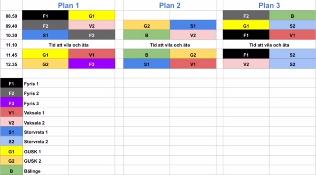 Hej, På lördag är det dags för sammandrag för tjejerna igen. Det är Fyris som ordnar och det är på Stenhagens IP, gräsplanerna nära ICA Maxi, bredvid konstgräsplanen. Det är osäkert om vi kommer att ha tillträdde till omklädningsrum så kom ombytta och med välfyllda vattenflaskor. Toalett kommer att finnas, men möjligen bara bajamaja. Det kommer finnas kiosk med försäljning av bland annat hamburgare och korv. Vi kör två lag som vanligt. Lag 1 "gul" Matcher: 8.50 (plan 1), 9.40 (plan 3) och 11.45 (plan 1) Tränare: Katrin och Thomas Samling: 8.30 ombytta och redo för uppvärmning vid planen (kom gärna 10 min före) Alice G Annie Ö Britta S Julia E Liv Märta R Roya Signe Stella Lag 2 "svart" Matcher: 9.40 (plan 2), 11.45 (plan 2) och 12.35 (plan 1) Tränare: Anna-Karin och Basse Samling: 9.15 ombytta och redo för uppvärmning vid planen (kom gärna 10 min före) Essi Ella R Helin Julia G Kajsa Laleh Lovisa Mila Ev. Märta V om hon kan och vill (ny)